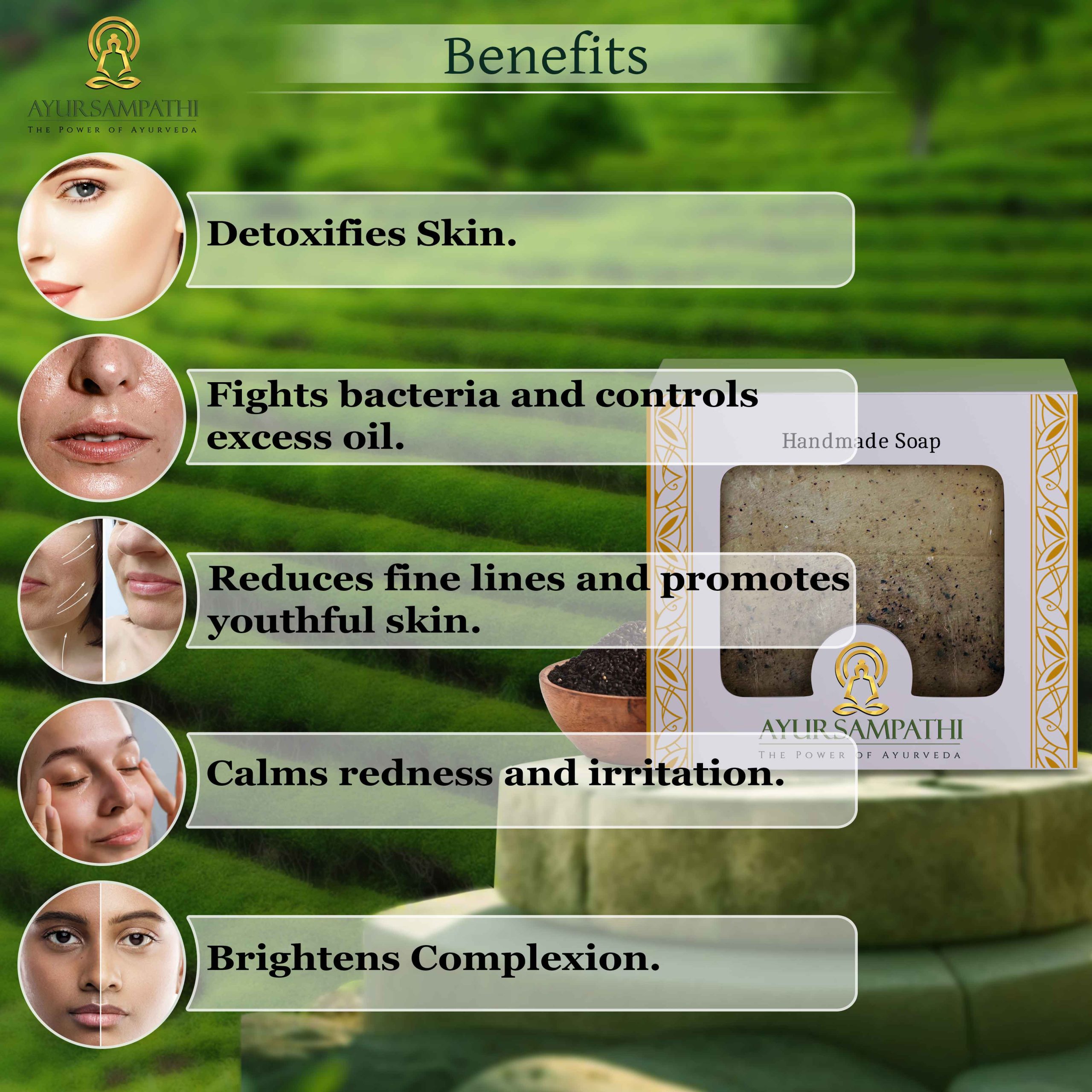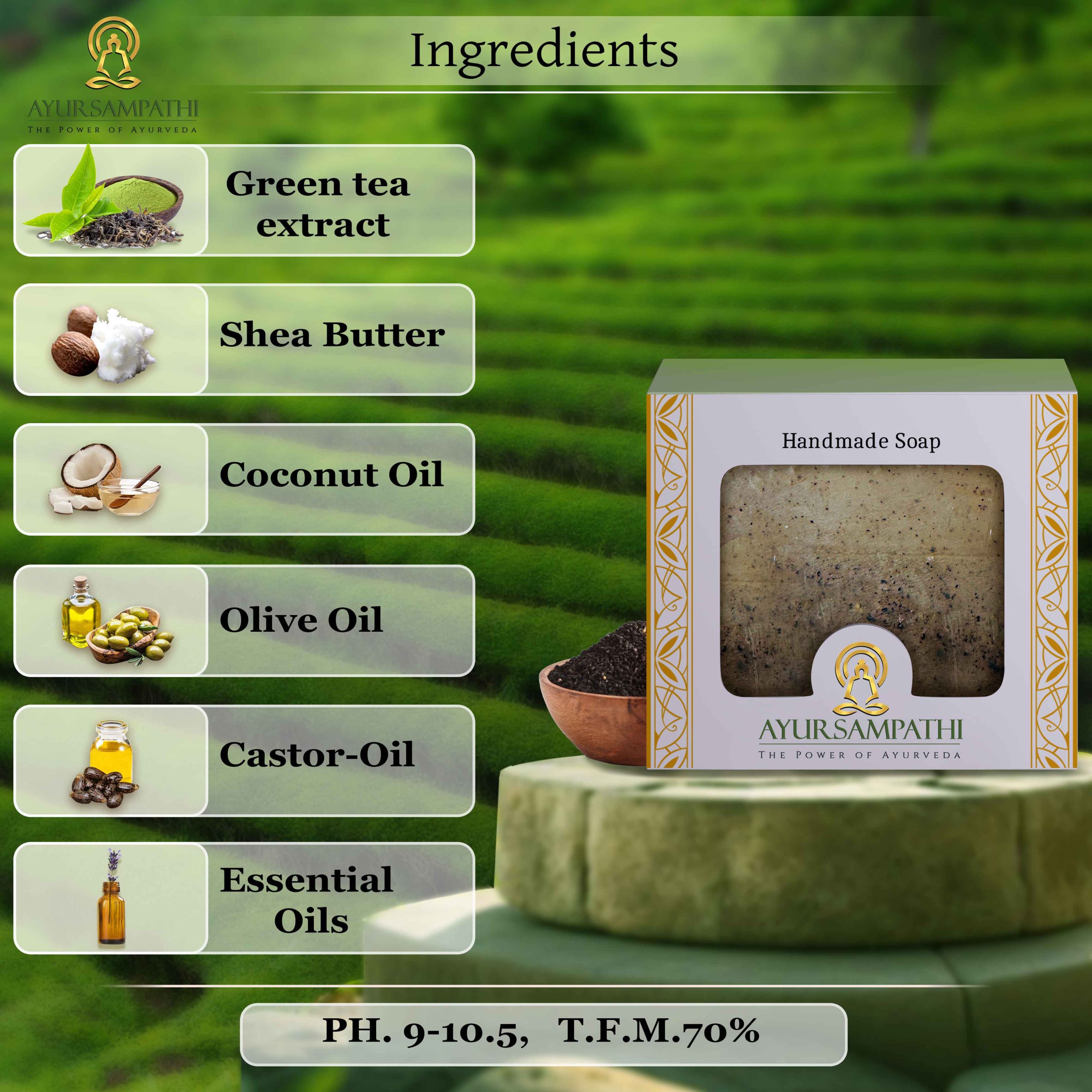 Refresh and nourish your skin with the natural goodness of our Ayurvedic Handmade Green Tea Soap. Infused with antioxidant-rich green tea extracts and blended with traditional Ayurvedic herbs, this gentle soap offers a soothing and rejuvenating cleanse for your skin.